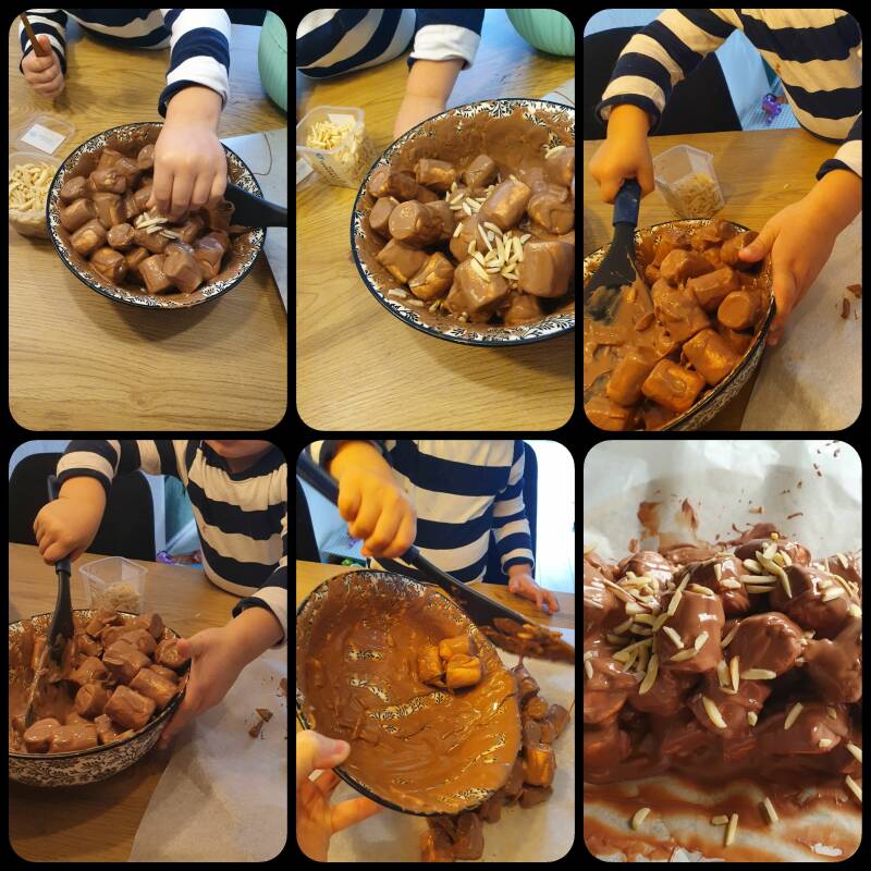 Roer de nootjes goed door het marshmallows chocolade mengsel. Je kunt nootjes naar keus gebruiken wij hebben gekozen voor amandelen. Als de hoeveelheid nootjes naar wens is, is het mengsel klaar. We scheppen het mengsel op bakpapier en maken een mooie berg. Amine heeft de berg nog gedecoreerd met nootjes maar je kunt ook sprinkels of andere versiering gebruiken. Als je berg klaar is moet de chocolade uitharden in de koelkast. Wanneer de chocolade is uitgehard kun je de berg in stukjes snijden en zie je de mooie structuur van de chocolade en de marshmallows. Dit geeft een leuk berg/rotsachtig effect. Amine laat in de foto collage zien hoe we te werk zijn gegaan.