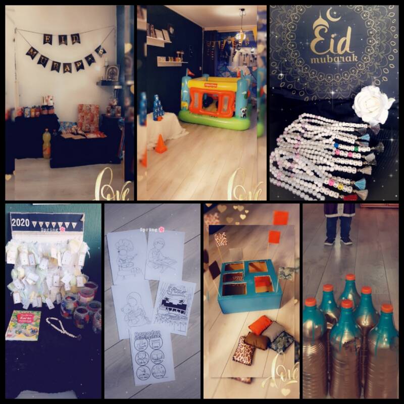 Vorig jaar met eid al fitr hadden we een geweldig springkussen. Omdat de weersvoorspelling twijfelachtig waren heb ik het springkussen in de woonkamer gezet. Ik had leuke activiteiten georganiseerd zoals: blikgooien,zandzakken gooien, bowlen kleuren en lekker eten. Als geschenkjes voor onze dierbaren hadden we zelf tasbih kralen kettingen gemaakt om te gebruiken na het gebed. Ook vorig jaar heb ik Amine actief betrokken bij de Ramadan. Hij was nog erg klein i.p.v een opdrachtjes kalender had ik een Ramadan cadeau kalender gemaakt. Met in elk zakje een kleinigheidje, een snoepje of een klein cadeautje zoals een auto.