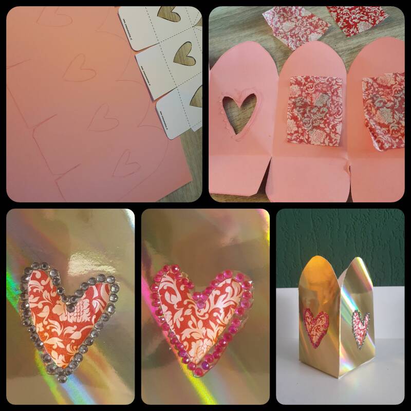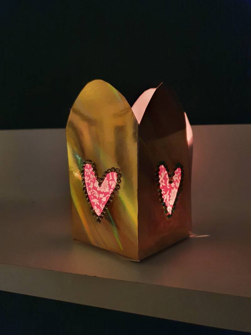 Je kunt je lantaarntje of cadeau doosje versieren naar wens. Ik heb er voor gekozen om diamamtjes rond om de hartjes te plakken. Dit is geheel naar eigen wens.