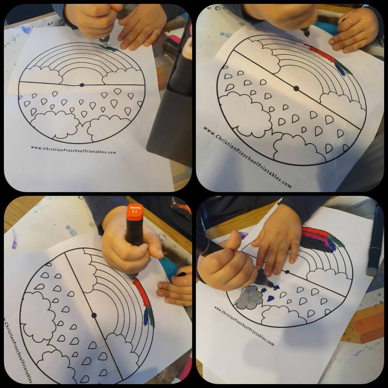 Kleur de printable met de allermooiste kleuren en gebruik hiervoor je fantasie. Je kunt de ark bijvoorbeeld kleuren met stiften, potloden, krijtjes maar je kunt de ark ook verven of zelfs glitter gebruiken. Knip daarna de ark uit en maak de weer cirkel vast aan de ark.